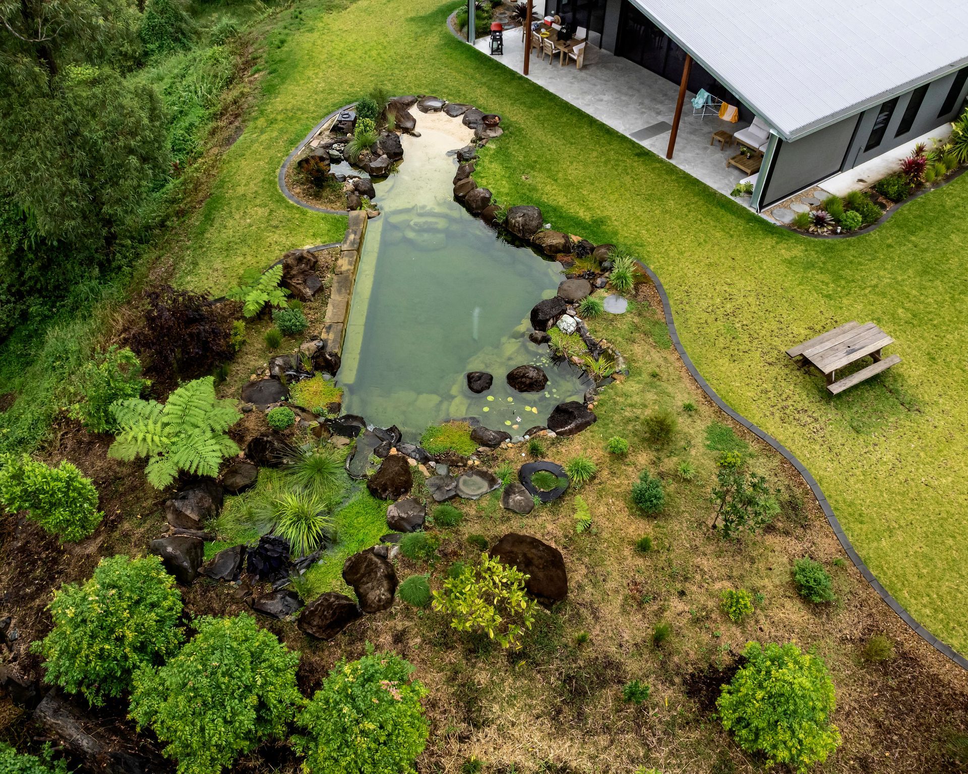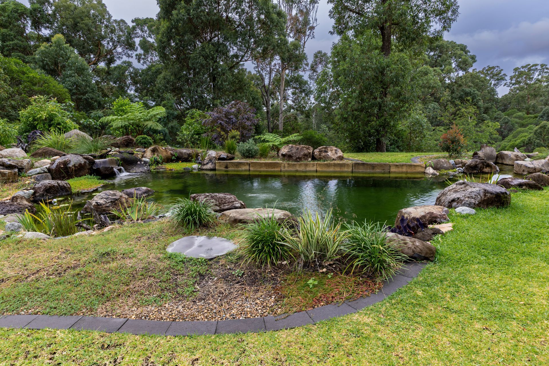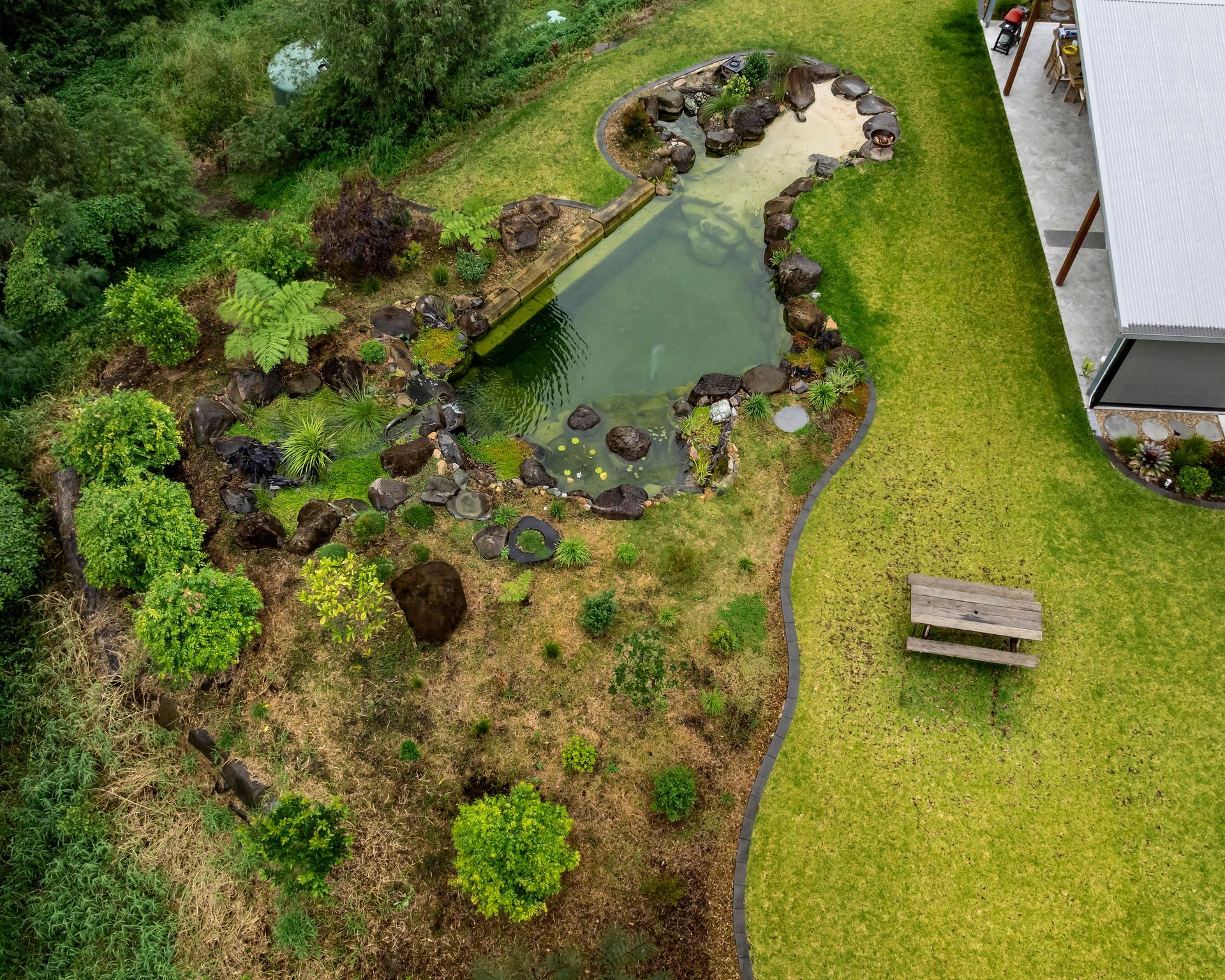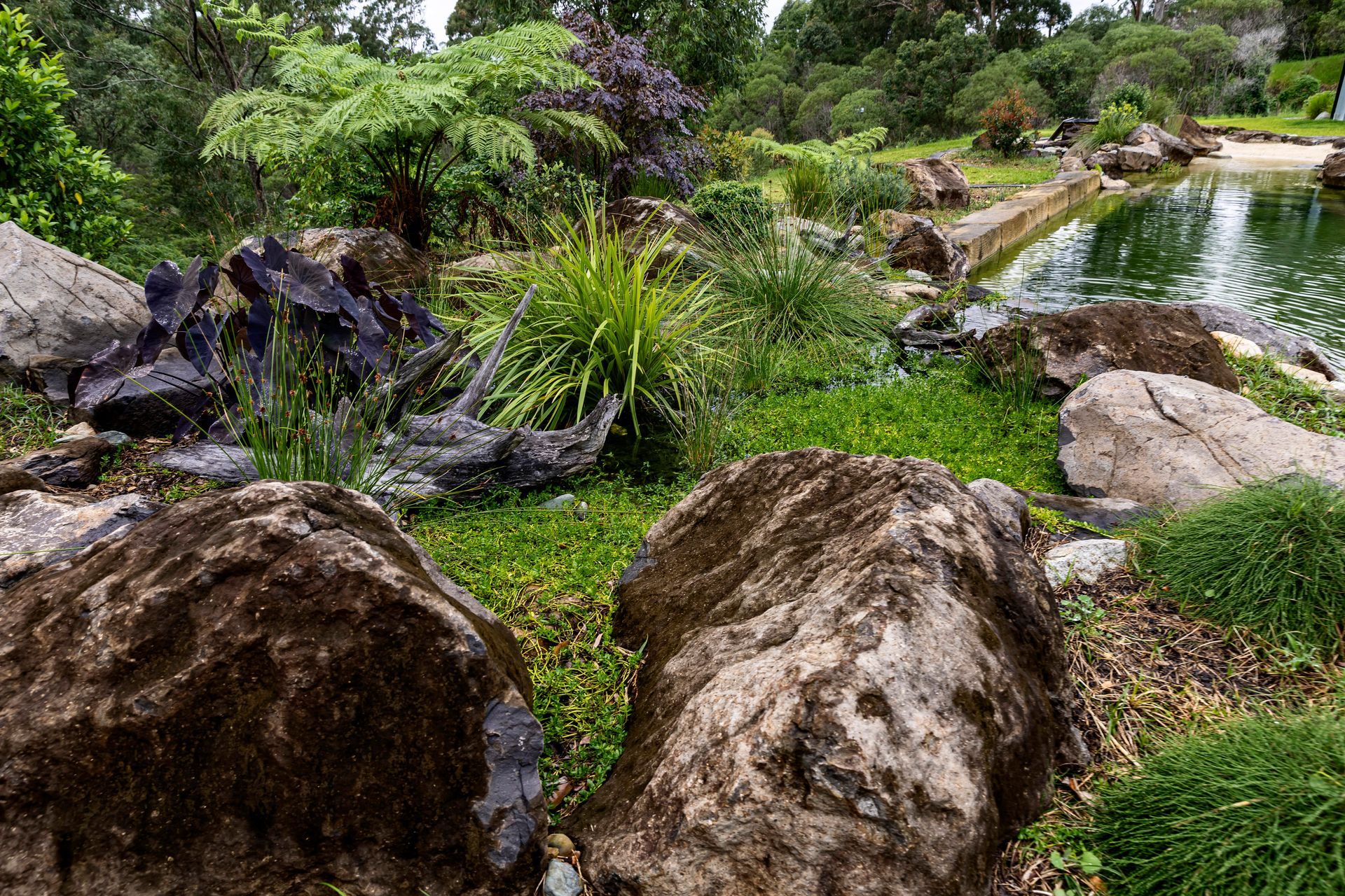 7m long submerged sandstone bench seat in the pond