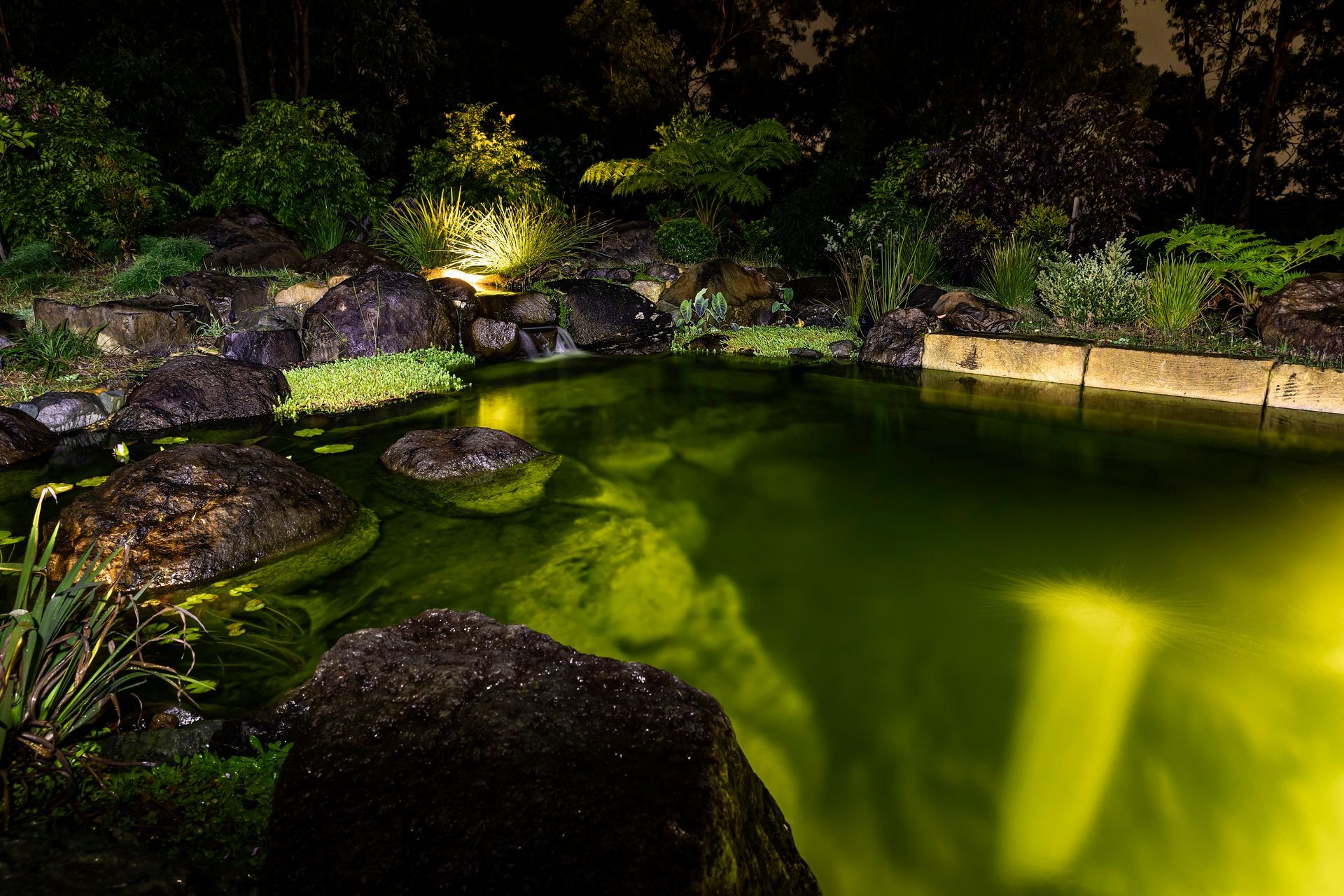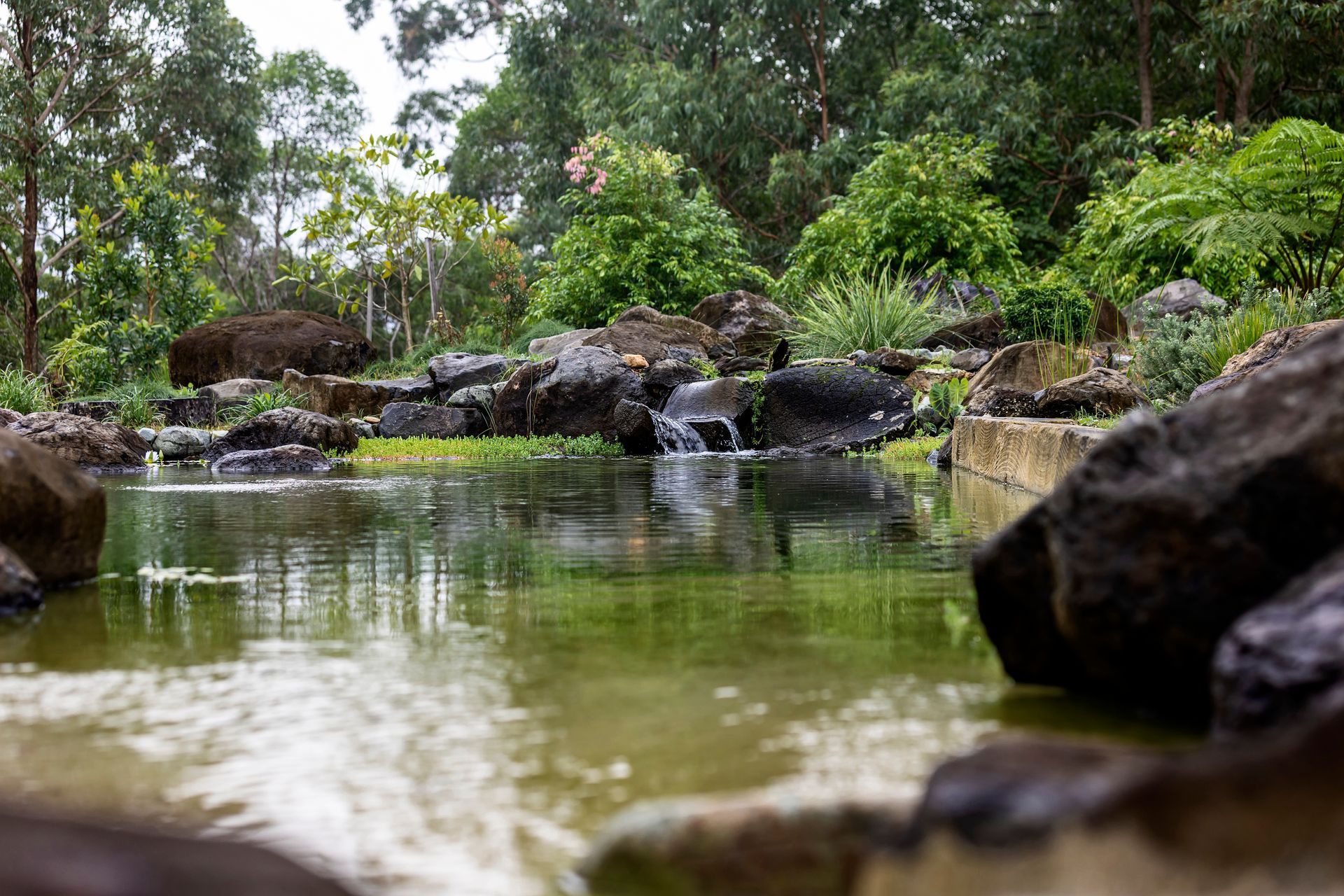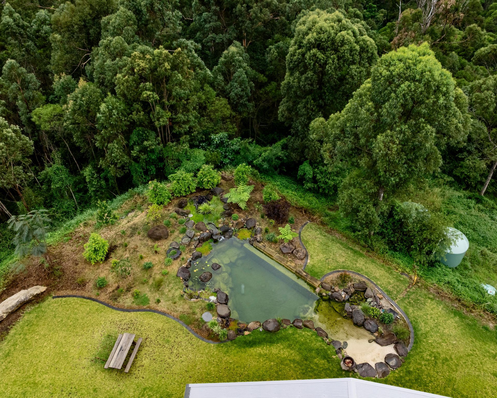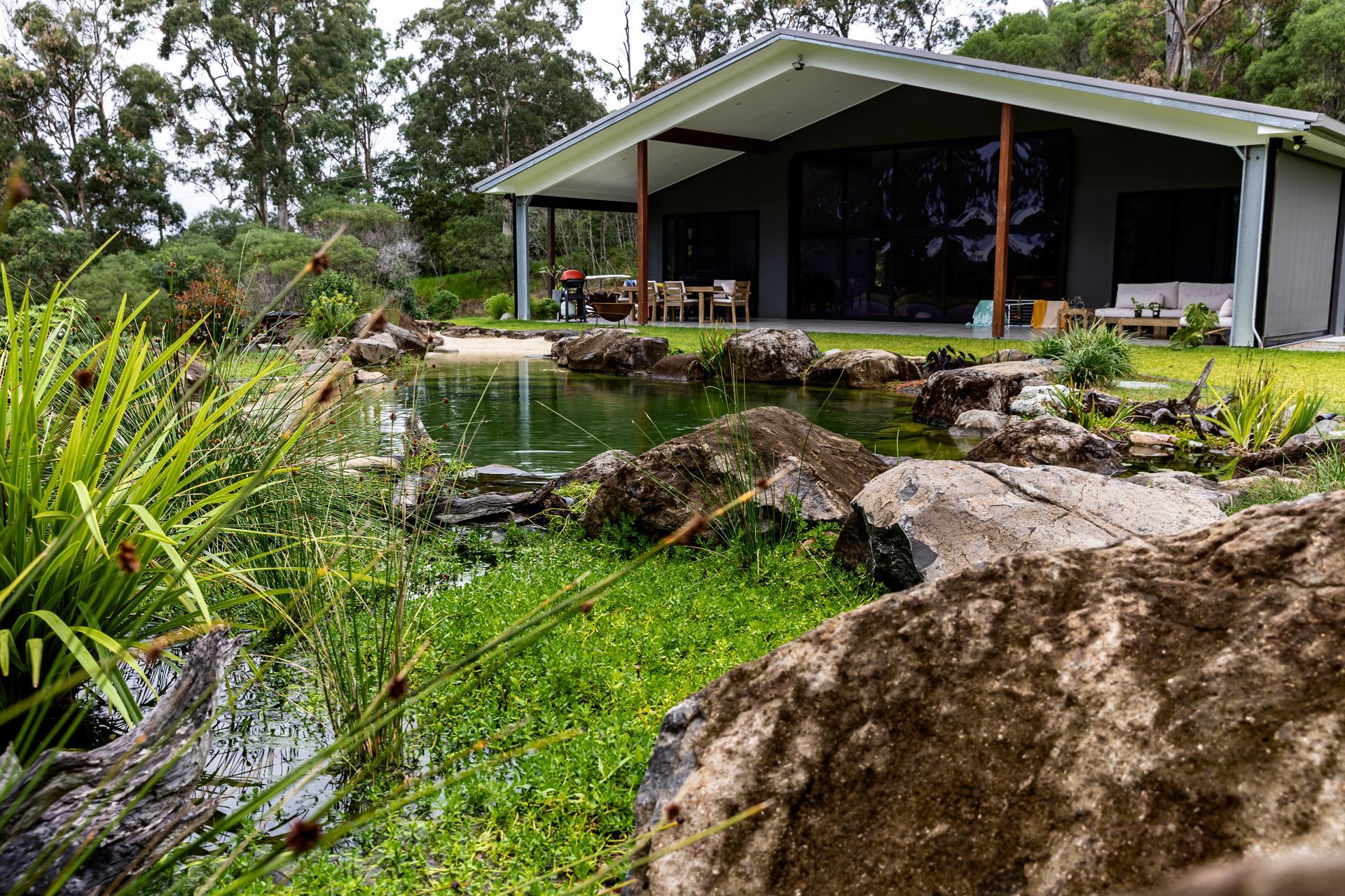 7m long submerged sandstone bench seat in the pond